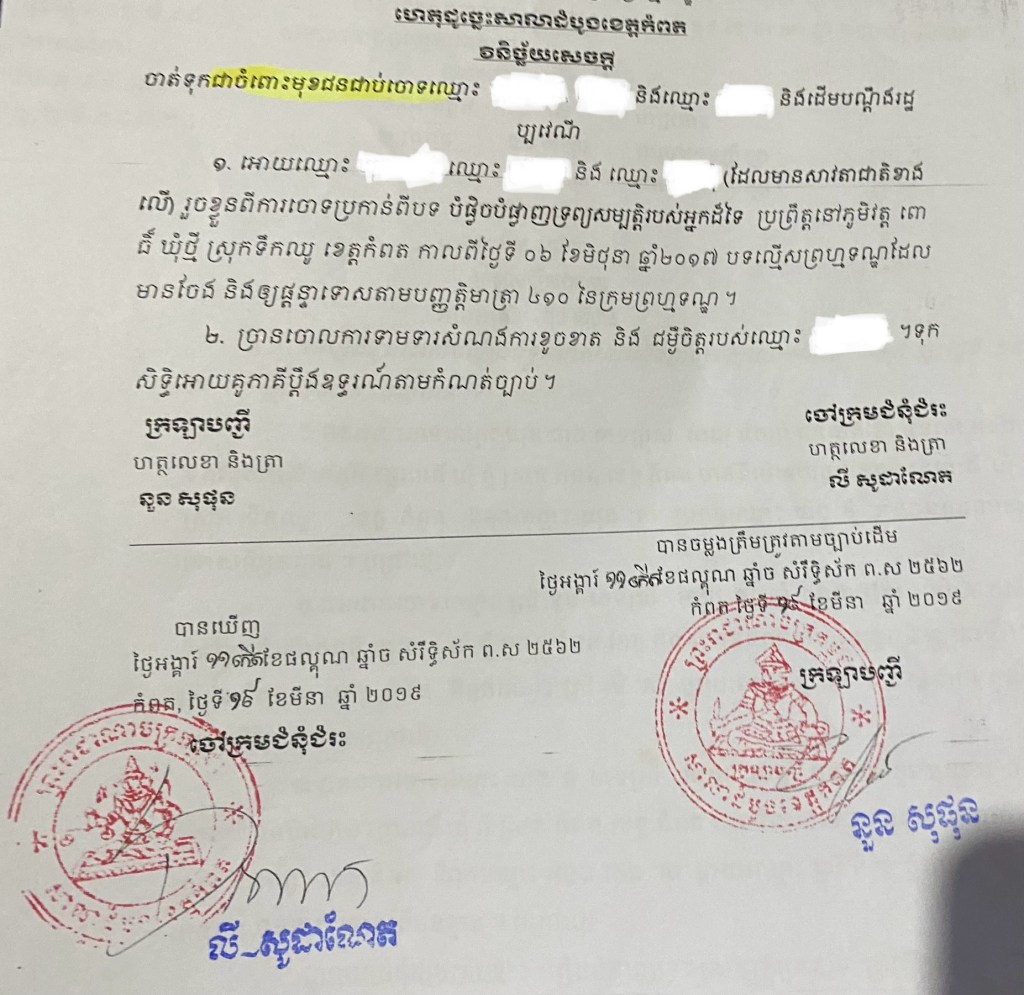 ក្រោយពីបានរង់ចាំដោយអន្ទះសាអស់រយៈពេល ២សប្តាហ៍មក នៅថ្ងៃនេះ ថ្ងៃអង្គារ ១៤កើត ខែផល្គុន ឆ្នាំច សំរឺទ្ធិស័ក ព.ស. ២៥៦២ ត្រូវនឹងថ្ងៃទី ១៩-មិនា-២០១៩ សាលាដំបូងខេត្តកំពតបានបើកសវនាការប្រកាសសេចក្តីសម្រេច ដោយឲ្យជនជាប់ចោទទាំង៣ រូប បានរួចផុតពីការចោទប្រកាន់ ។ ការសម្រេចបែបនេះគឺជាទង្វើល្អ ប្រកបដោយក្តីយុត្តិធ៌មរបស់ស្ថាប័នតុលាការ និងជាទីទំនុកចិត្តរបស់ប្រជាពលរដ្ឋ ហើយក៏សូមឲ្យសកម្មភាពល្អនេះបន្ត និងមានសំរាប់គ្រប់ករណីវិវាទផ្សេងៗទៀតផងដែរ ៕ As a result, the judgment announcement on March 19th, 2019 for all three accused are non-guilty.