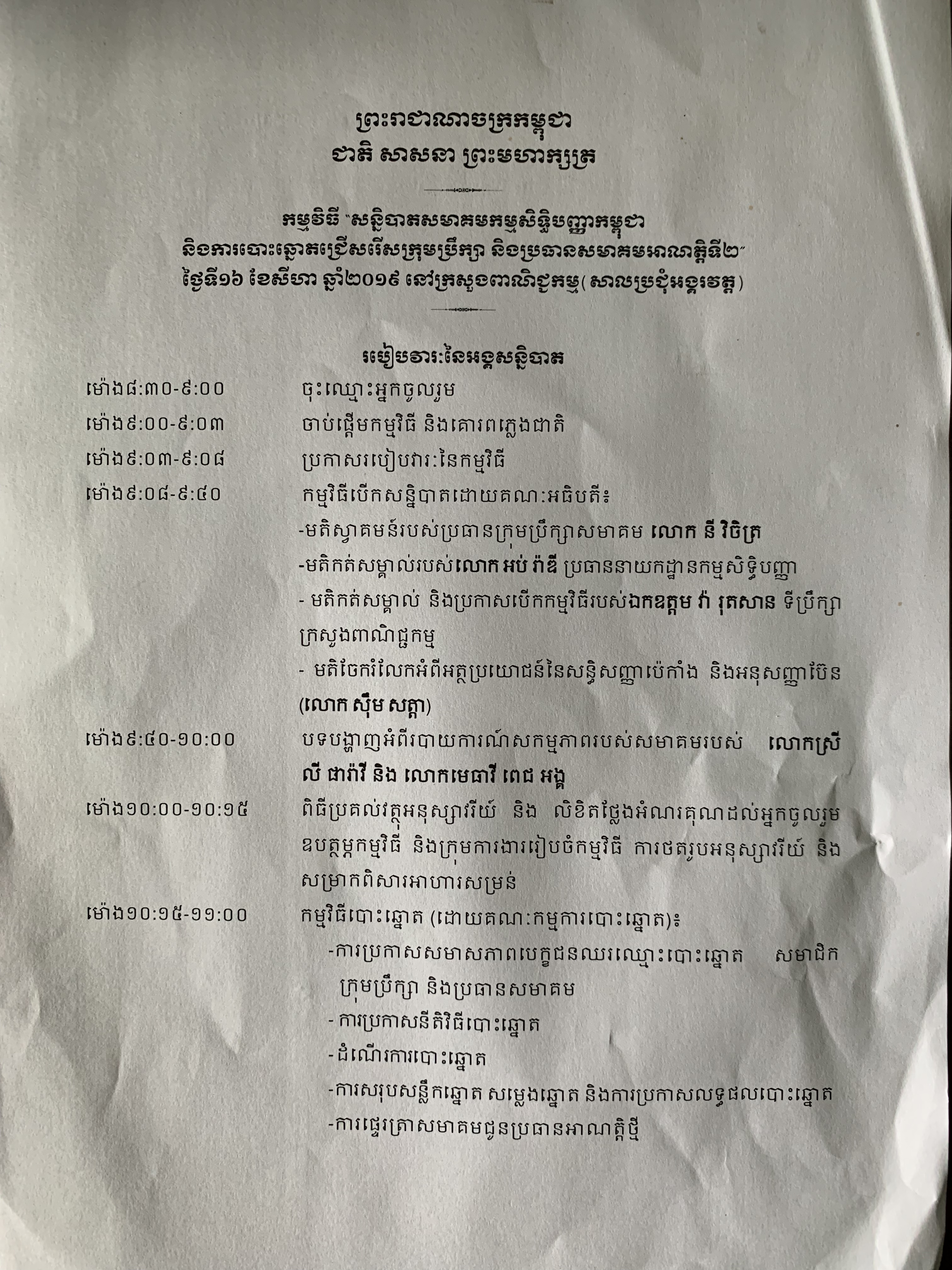 អនុវត្តតាមរបៀបវារៈ ដំណើរការរបស់ន្និបាតបានប្រព្រឹត្តទៅយ៉ាងរលូន និងប្រកបដោយបរិកាសរីករាយ និងមោទនភាព ដោយចាប់ផ្តើមពីតំណាងស្ថាប័នពាក់ព័ន្ធនឹងផ្នែកកម្មសិទ្ធិបញ្ញា ដូចជាក្រសួងពាណិជ្ជកម្ម ក្រសួងវប្បធម៌ និងវិចិត្រសិល្បៈ ក្រសួងឧស្សាហកម្ម និងសិប្បកម្ម ។ល។ មានយោបល់ និងចំណាប់អារម្មណ៍ និងការធ្វើបទបង្ហាញ និងដាក់របាយការណ៍ការងារអាណត្តិទី១ ដោយប្រធាន និងអនុប្រធាន សមាគមកម្មសិទ្ធិបញ្ញាមក ប្រធានថ្មី លោកស្រី មេធាវី សេង វួចហ៊ុន និងក្រុមប្រឹក្សាចំនួន ៧រូប ដែលបានជាប់ឆ្នោត បានធ្វើការប្តេជ្ញា និងតាំងចិត្តបំរើសមាគម ដោយយកអស់ពីកំលាំងកាយ ចិត្ត ក្នុងគោលដៅធ្វើឲ្យគោលបំណងរបស់សមាគមអាចសម្រេចបានលទ្ធផលខ្ពស់ ។ លើសពីនេះ អ្នកដឹកនាំថ្មីទាំងនោះ ក៏បានស្នើសុំអ្នកដឹកនាំចាស់ និងស្ថាប័នពាក់ព័ន្ធនានា នៅតែបន្តការគាំទ្រ និងជួយជ្រុមជ្រែងដើម្បីឲ្យសមាគមអាចទទួលបានជោគជ័យផងដែរ ៕