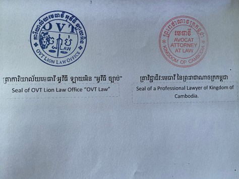 One thought on “ត្រូវបានអនុញ្ញាតឲ្យប្រេីប្រាស់ត្រាមូលសំរាប់ការិយាល័យមេធាវី អូវីធី ឡាយអិន «អូវីធី ច្បាប់» Be permitted to use a Seal for OVT Lion Law Office «OVT Law»”