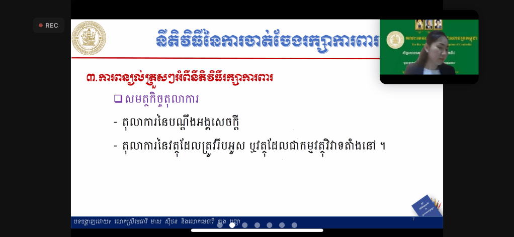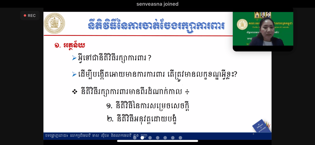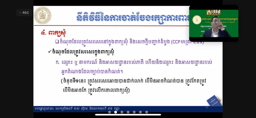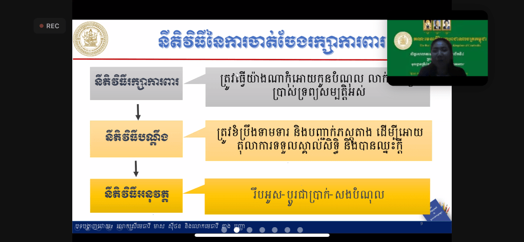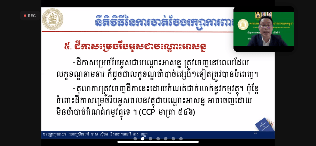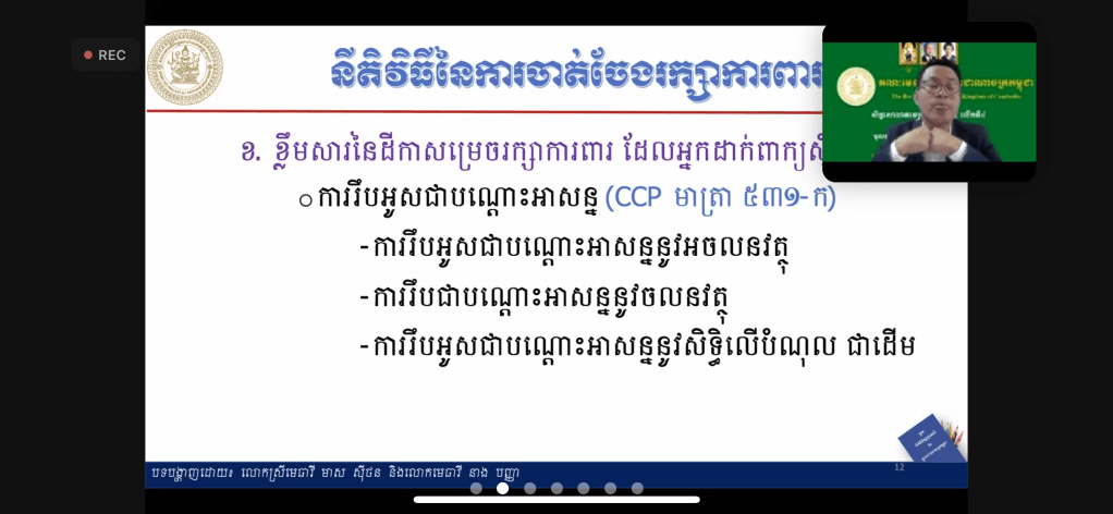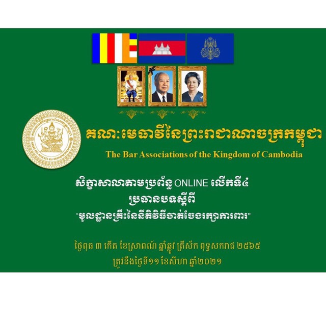 សិក្ខាសាលាបានប្រព្រឹត្តទៅនៅថ្ងៃទី១១-សីហា-២០២១ ចាប់ពីម៉ោង៨ព្រឹក-១១:៣០នាទីព្រឹក តាមរយៈប្រព័ន្ធហ្សូមពីរាជធានីភ្នំពេញ ក្រោមការរៀបចំដោយគណៈមេធាវីនៃព្រះរាជាណាចក្រកម្ពុជា។ This workshop is conducted today at 8:00 am-11:30am by a Zoom Webinar from Phnom Penh and organized by Bar Association of the Kingdom of Cambodia.