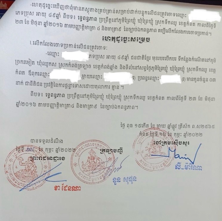 យោងតាមការស្រាវជ្រាវរបស់សាលាដំបូងខេត្តកំពត និងសាលាដំបូងខេត្តបន្ទាយមានជ័យ ពួកគេត្រូវបានឲ្យរួចផុតពីការចោទប្រកាន់ ជាពិសេសជនត្រូវចោទចុងក្រោយដែលជាអតីតប្តី ត្រូវបានលើកលែងចោទប្រកាន់ តាមរយៈដីកាដំណោះស្រាយលេខ ១៥ ព្រ.ទ/២២ ចុះថ្ងៃទី១៦-កុម្ភៈ-២០២២ ។ នេះជាកាយវិការដ៏ល្អប្រពៃរបស់ស្ថាប័នតុលាការ និងអយ្យការអមសាលាដំបូងខេត្តកំពត ដែលបានផ្តល់នូវភាពយុត្តិធម៌ និងសច្ចៈភាពដល់កូនក្តី និងសូមឲ្យទង្វើទាំងនេះបន្តជានិច្ចនិរន្តន៍៕