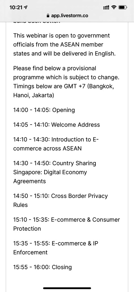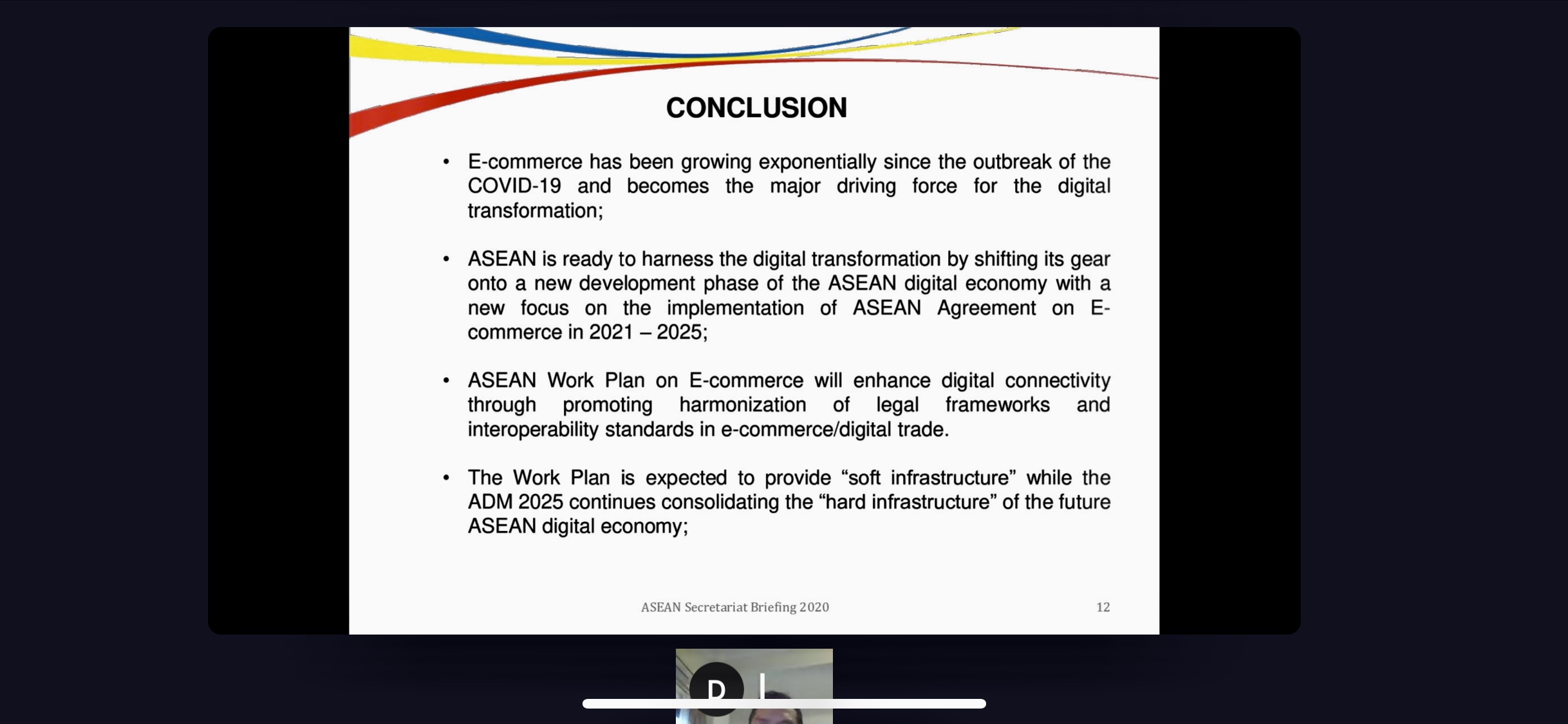 The Webinar will be held in conjunction with Singapore’s IP Week@SG conference. The theme for this webinar is E-commerce regulations and IP in ASEAN with the purpose of coverning E-commerce and digital policy makers from across the ASEAN member states to understand and discuss the latest developments in E-commerce policy, regulation, consumer behavior trends and how policy makers can leverage the growing E-commerce sector to build back better.