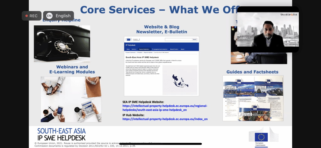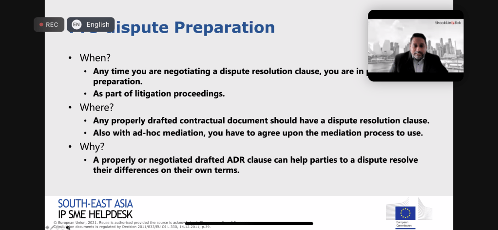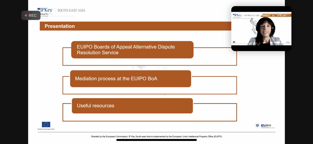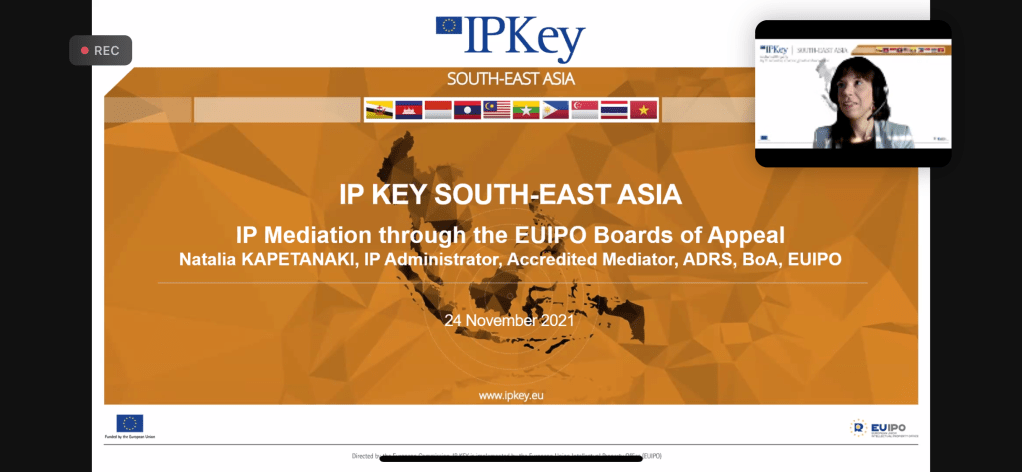 សិក្ខាសាលាផ្តោតទៅលេីការដោះស្រាយវិវាទកម្មសិទ្ធិបញ្ញាតាមយន្តការសន្ធានកម្ម (ការសម្រុះសម្រួលវិវាទ) ប្រព្រឹត្តិទៅនៅការិយាល័យកម្មសិទ្ធិបញ្ញាសហភាពអឺរុប (EUIPO) នៅប្រទេសឥណ្ឌូណេស៊ី នៅប្រទេសហ្វីលីពីន នៅប្រទេសសិង្ហបុរី នៅប្រទេសថៃ និងយុទ្ធសាស្ត្រសំរាប់សន្ធានកម្មវិវាទកម្មសិទ្ធិបញ្ញាចំពោះសហគ្រាសជំនួញធុនតូចនិងមធ្យម។