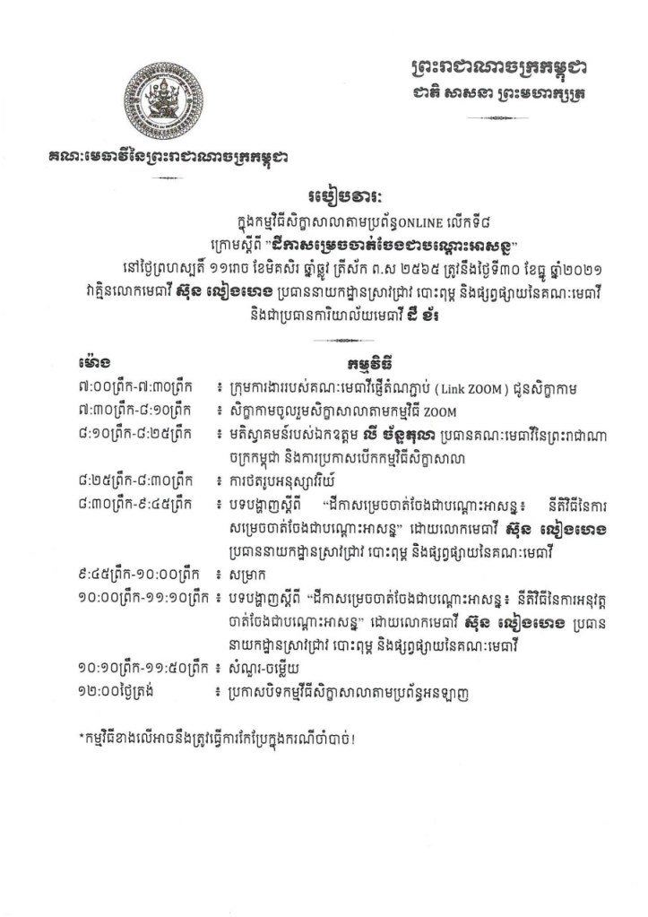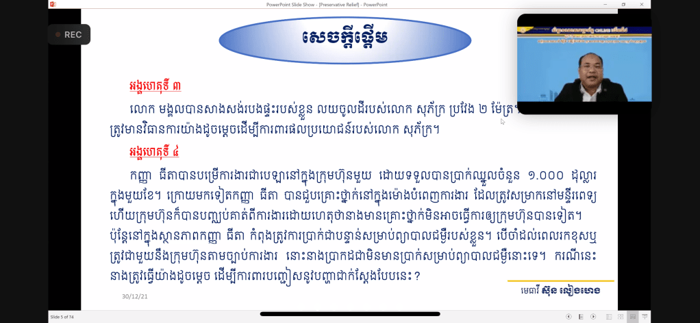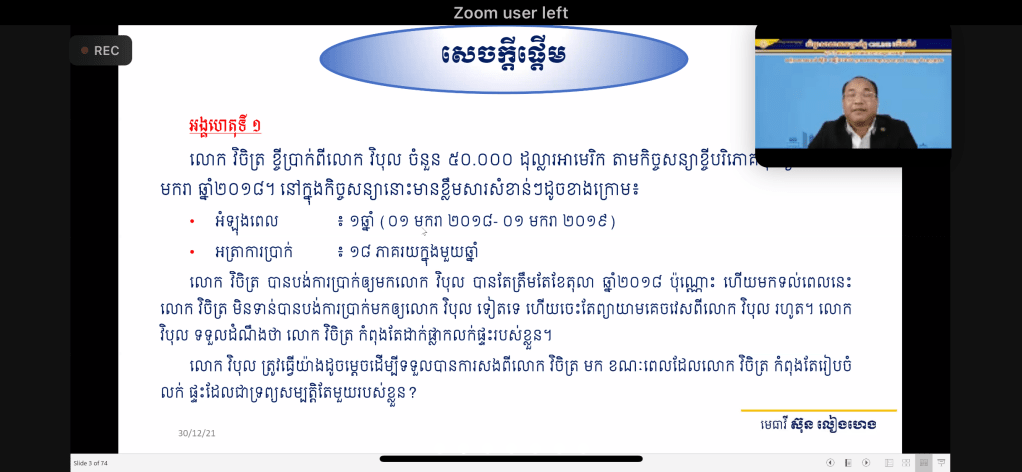 សិក្ខាសាលានេះបានប្រព្រឹត្តទៅនៅថ្ងៃទី៣០-ធ្នូ-២០២១ តាមរយៈប្រព័ន្ធហ្សូមពីរាជធានីភ្នំពេញ ក្រោមការរៀបចំដោយគណៈមេធាវីនៃព្រះរាជាណាចក្រកម្ពុជា និងមានរបៀបវារៈដូចខាងក្រោម៖