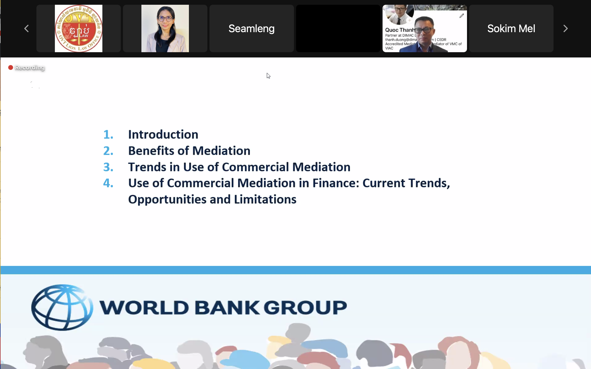 សាលាស្តីពីផលប្រយោជន៍នៃសន្ធានកម្មចំពោះការដោះស្រាយវិវាទពាណិជ្ជកម្ម (Workshop on Benefits of Resolving Commercial Disputes through Mediation) បានប្រពឹត្តិទៅនៅថ្ងៃទី៨-មិនា-២០២២ តាមរយៈប្រព័ន្ធហ្សូមពីរាជធានីភ្នំពេញ ក្រោមការរៀបចំដោយមជ្ឈមណ្ឌលជាតិនៃមជ្ឈត្តការផ្នែកពាណិជ្ជកម្ម (ម.ជ.ម.) ហេីយមានដំណេីរការនិងខ្លឹមសារដូចតទៅ៖ IFC_NCAC_Mediation_Awareness_Event_Agenda_as_of_March_3,_2022