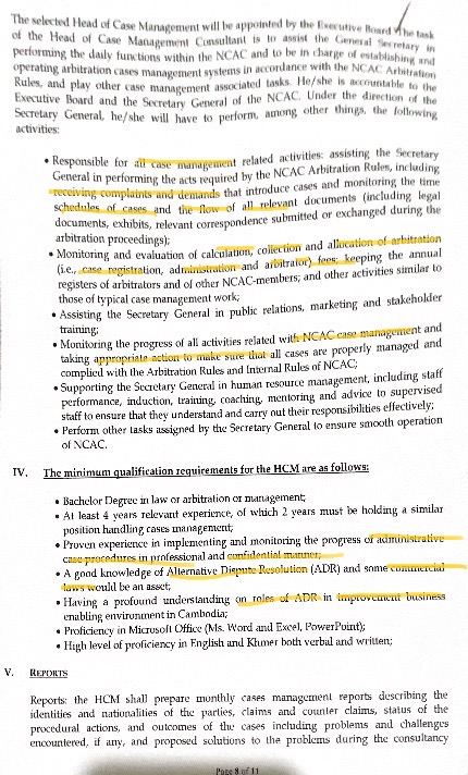 ផ្អែកលើកិច្ចសហប្រតិបត្តិការរវាងក្រសួងពាណិជ្ជកម្មកម្ពុជា ធនាគាពិភពលោក និងមជ្ឈមណ្ឌលជាតិនៃមជ្ឈត្តការផ្នែកពាណិជ្ជកម្ម (ម.ជ.ម.) នៅឆ្នាំ២០១៥ក្រោមជំនួយរបស់ធនាគារពិភពលោក ម.ជ.ម.ទទួលបានការជួយឧបត្ថម្ភជំនាញបច្ចេកទេសលើការចាត់ចែងកិច្ចដំណើរការរបស់ខ្លួនដោយក្នុងនោះក៏មានតួនាទីជានាយកគ្រប់គ្រងសំណុំរឿងមជ្ឈត្តការនៃម.ជ.ម. (Head of Case Management “HCM”) ត្រូវបានតម្រូវផងដែរ ។ តើអ្នកកាន់តួនាទីនេះមានគុណសម្បត្តិបែបណា ជ្រើសរើសយ៉ាងម៉េច និងមានមុខងារអ្វីខ្លះ?