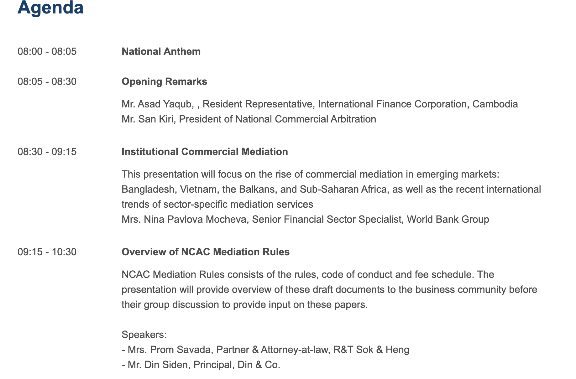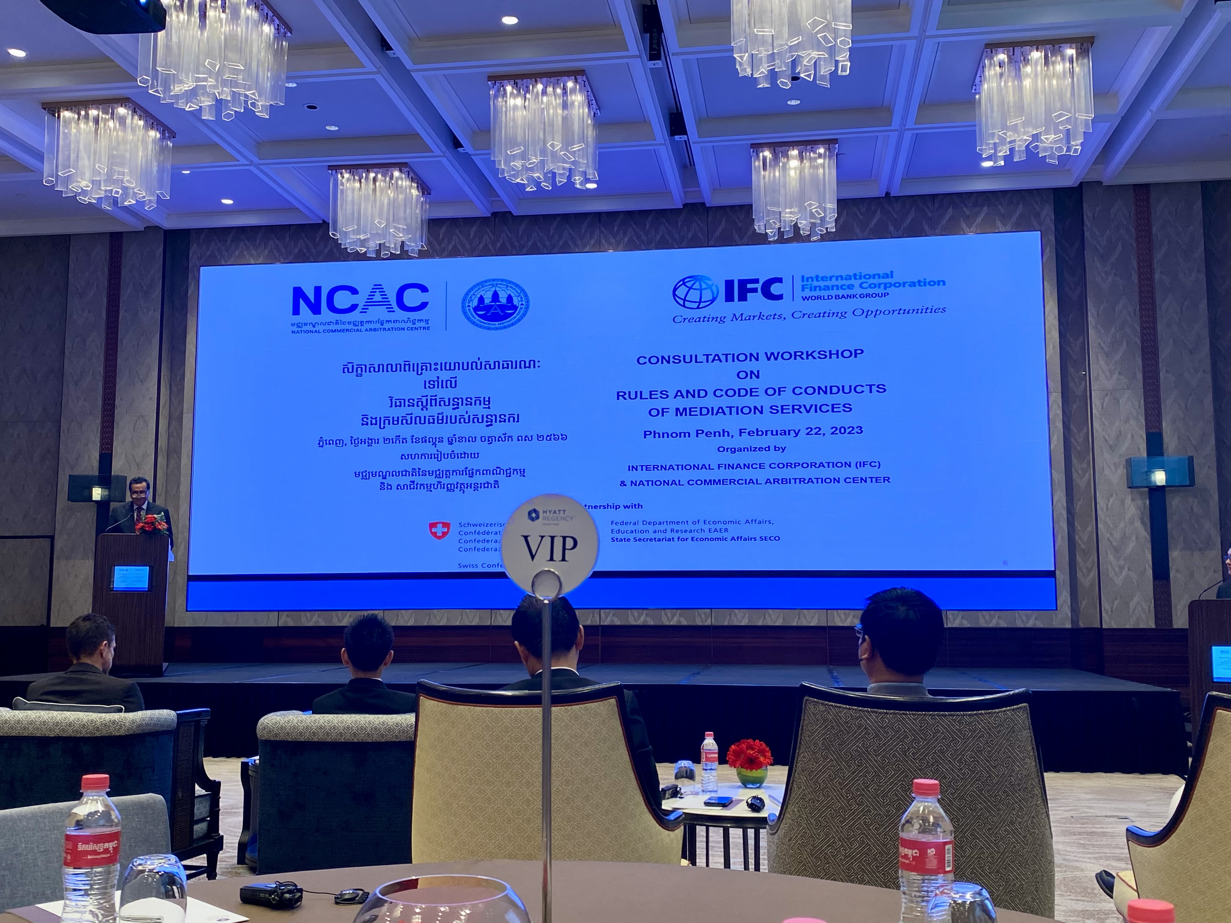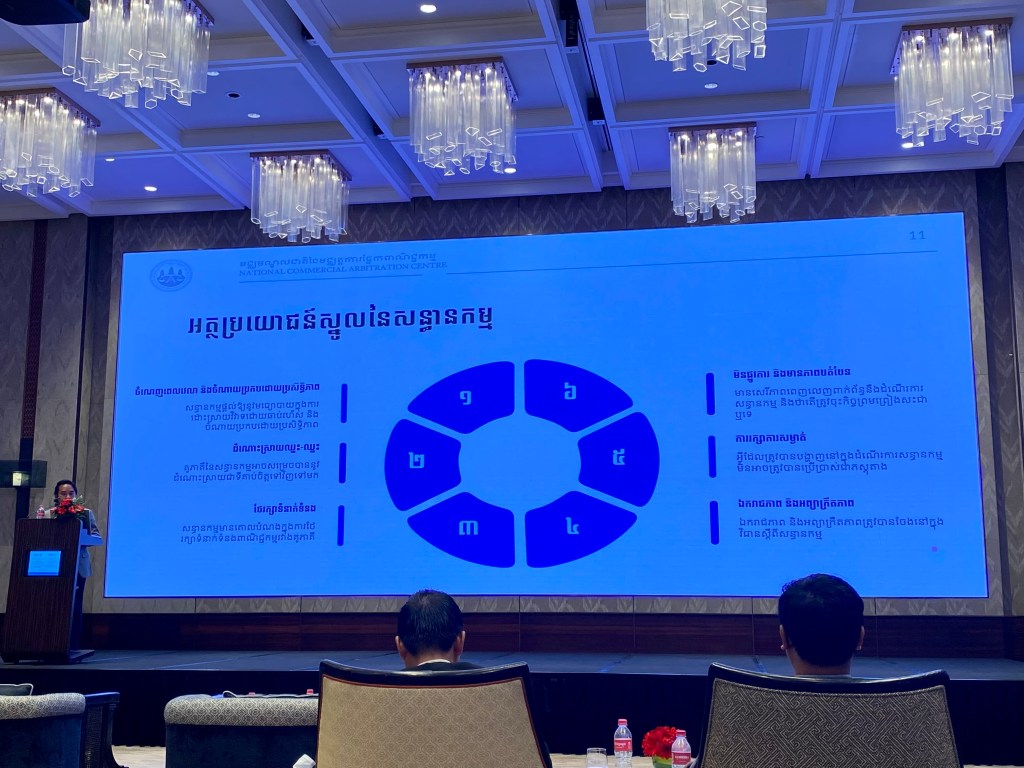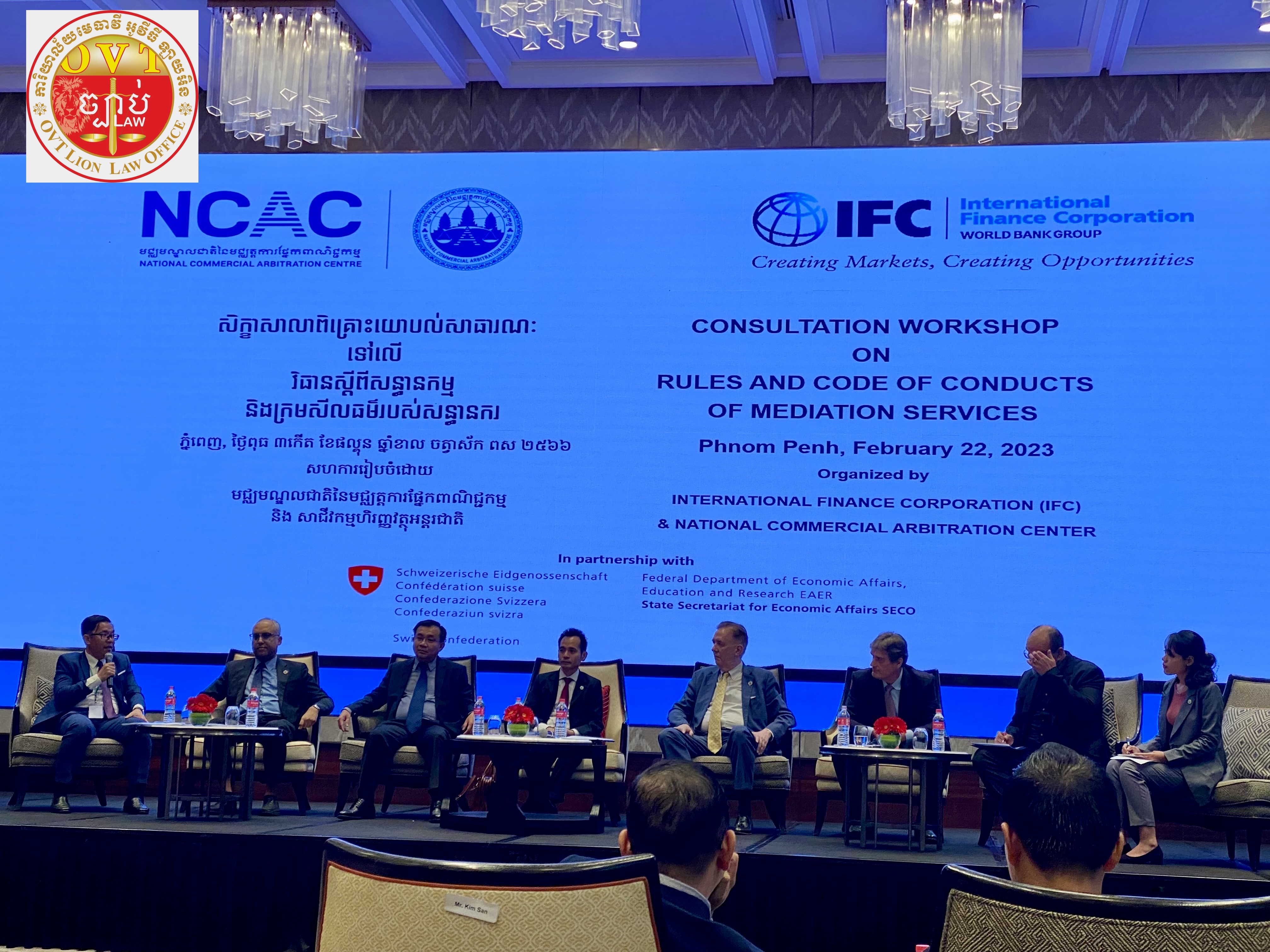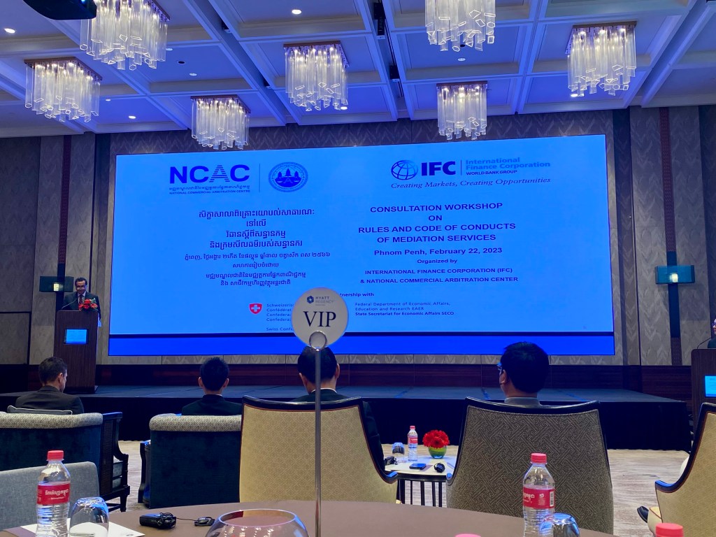 ការពិគ្រោះយោបល់ជាសាធារណៈស្តីពីវិធានសន្ធានកម្ម និងក្រមសីលធម៌របស់សន្ធានករនៃមជ្ឈមណ្ឌលជាតិនៃមជ្ឈត្តការផ្នែកពាណិជ្ជកម្ម (ម.ជ.ម.) Public Consultation on NCAC’s Mediation Rules and Code of Conducts for Mediators បានប្រព្រឹត្តិទៅនៅថ្ងៃទី២២-កុម្ភៈ-២០២៣ នារាជធានីភ្នំពេញ ក្រោមកិច្ចសហការរៀបចំដោយម.ជ.ម. (NCAC) និងសាជីវកម្មហិរញ្ញវត្ថុ (IFC) ហើយមានរបៀបវារៈ និងដំណើរការដូចខាងក្រោម៖
