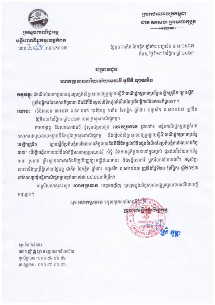 សិក្ខាសាលាស្តីពីប្រតិបត្តិការដែលមានកិច្ចធានា និងនីតិវិធីតម្កល់លិខិតជូនដំណឹងរបស់វា បានប្រព្រឹត្តទៅនៅថ្ងៃទី២០-វិច្ឆិកា-២០២៣ នាមន្ទីរពាណិជ្ជកម្មខេត្តកំពត ក្រោមការរៀបចំដោយនាយកដ្ឋាននីតិកម្ម ក្រសួងពាណិជ្ជកម្មសហការជាមួយមន្ទីរពាណិជ្ជកម្មខេត្តកំពត ។ អ្នកចូលរួម គឺជាសិក្ខាកាមតំណាងឲ្យស្ថាប័នពាក់ព័ន្ធនឹងវិស័យនេះដែលកំពុងប្រកបអាជីវកម្មនៅក្នុងខេត្តកំពត រួមមាន៖ ក្រុមហ៊ុនបញ្ចាំ ហាងបញ្ចាំ ស្ថាប័នធនាគារ គ្រឹះស្ថានមីក្រូហិរញ្ញវត្ថុ សារការី មេធាវី ។ល។ លោកមេធាវី អ៊ូច វុធ្ធី ប្រធានប្រតិបត្តិ នៃការិយាល័មេធាវី អូវីធី ឡាយអិន «អូវីធី ច្បាប់» គឺជាសិក្ខាកាមម្នាក់ដែលត្រូវបានអញ្ជើញឲ្យចូលរួមក្នុងនាមជាតំណាងការិយាល័យមេធាវី ប្រចាំនៅខេត្តកំពត ផងដែរ ។