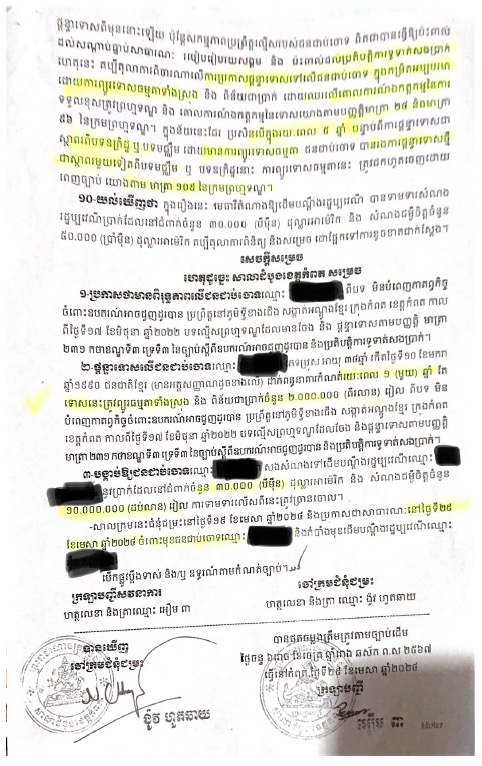 ជាលទ្ធផល តុលាការបានសម្រេចតាមរយៈសាលក្រមលេខ ២៨៥ ចុះថ្ងៃទី២៩-មេសា-២០២៤ ឲ្យជនជាប់ចោទ ដែលជាកូនក្តីទទួលបានអត្ថប្រយោជន៍៖ ជាប់ពិរុទ្ធភាពត្រឹម១ឆ្នាំ ដែលជាអប្បបរិមានៃទោស (១ឆ្នាំ-៣ឆ្នាំ) ហើយមិនត្រូវបានដាក់ក្នុងពន្ធនាគារទេ ពីព្រោះទោសនេះត្រូវបានព្យួរតាមធម្មតា និងផ្តល់សំណងជម្ងឺចិត្តត្រឹមតែ ដប់លានរៀល ប្រហែល US$ 2,500.00 (ពីរពាន់និងប្រាំរយដុល្លាអាមេរិក) ដែលខុសឆ្ងាយពីការទាមទាររបស់ដើមបណ្តឹងរដ្ឋប្បវេណីមានចំនួនរហូតដល់ US$ 50,000.00 (ប្រាំម៉ឺនដុល្លាអាមេរិក) ។ ប៉ុន្តែ ករណីនេះប្រសិនបើកូនក្តីប្តឹងឧទ្ធរណ៍ លទ្ធផលនៃសេចក្តីសម្រេច (សាលដីកា) អាចសង្ឃឹមរួចទោសទាំងពីរនេះទៀតផង ៕