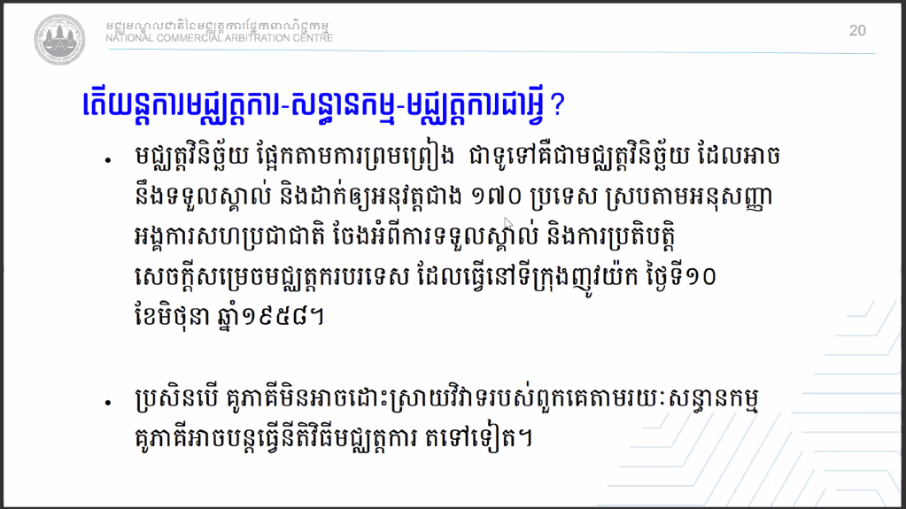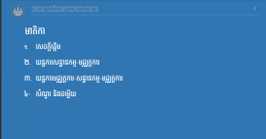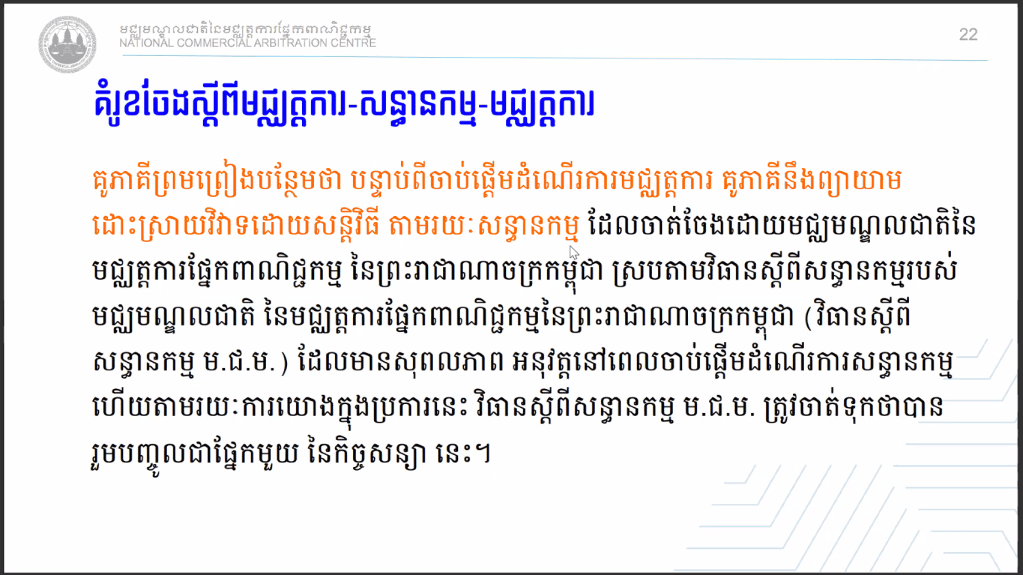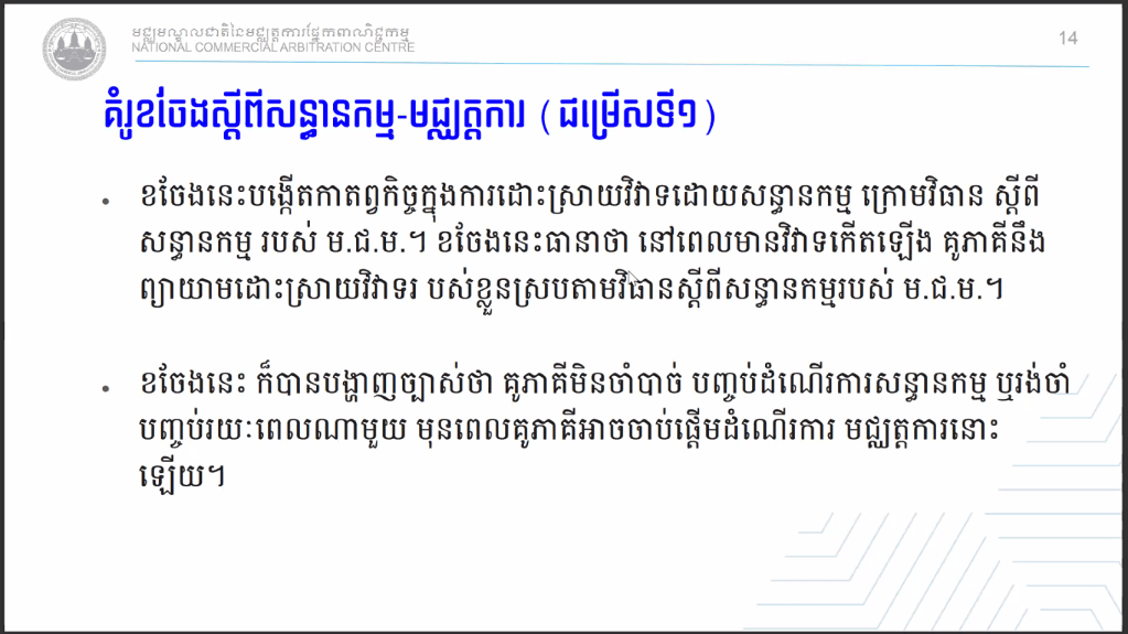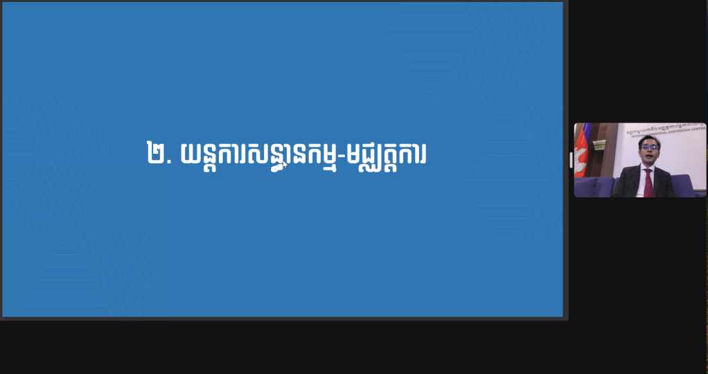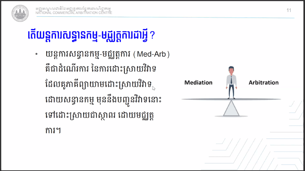 សិក្ខាសាលាស្ដីពីការដោះស្រាយវិវាទតាមយន្តការសន្ធានកម្ម-មជ្ឈត្តការ និងមជ្ឈត្តការ-សន្ធានកម្ម-មជ្ឈត្តការ របស់មជ្ឈមណ្ឌលជាតិនៃមជ្ឈត្តការផ្នែកពាណិជ្ជកម្ម (ម.ជ.ម.) Dispute Resolutions by Med-Arb & Arb-Med-Arb of National Commercial Arbitration Centre (NCAC) Webinar. បានប្រព្រឹត្តទៅនៅថ្ងៃនេះតាមរយៈប្រព័ន្ធថ្នាលបណ្តុះបណ្តាលបច្ចេកវិទ្យាពីភ្នំពេញ ក្រោមការរៀបចំដោយមជ្ឈមណ្ឌលជាតិនៃមជ្ឈត្តការផ្នែកពាណិជ្ជកម្ម (ម.ជ.ម.) ហើយមានខ្លឹមសារដូចតទៅៈ