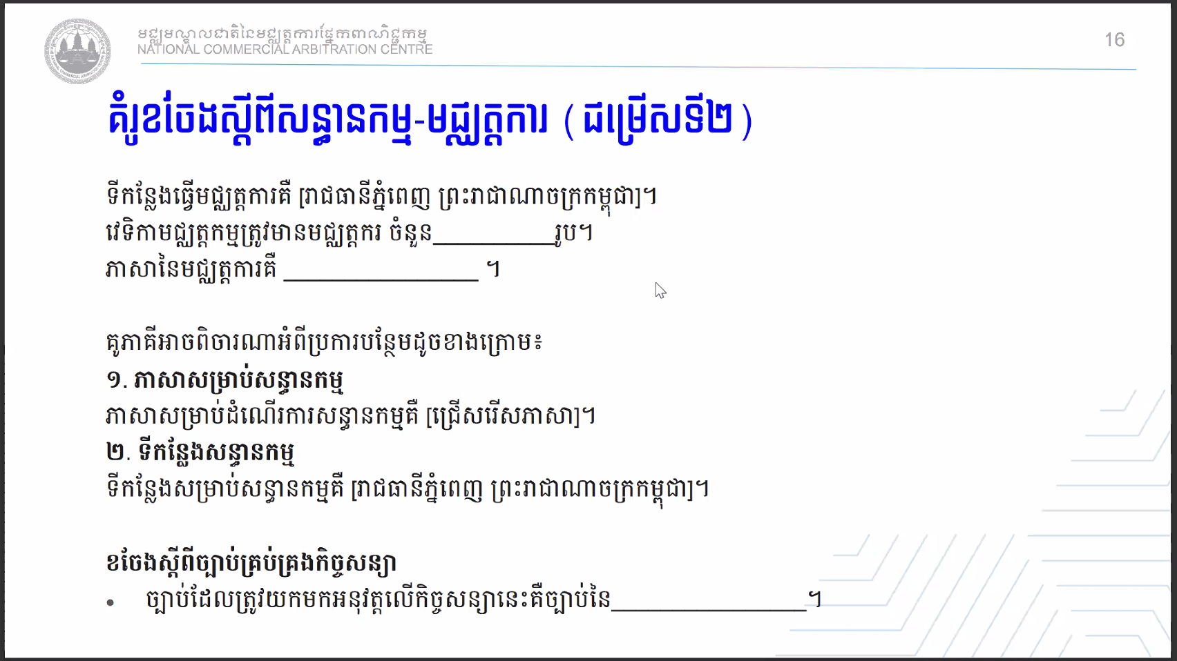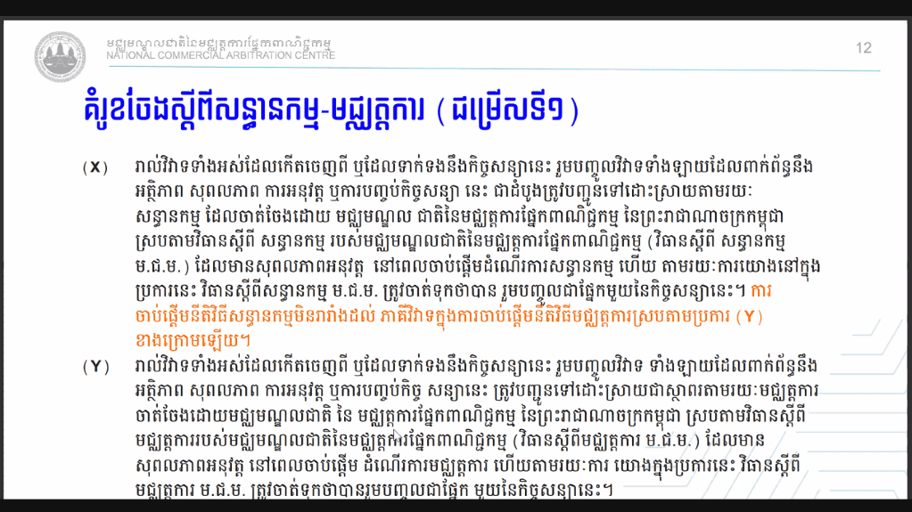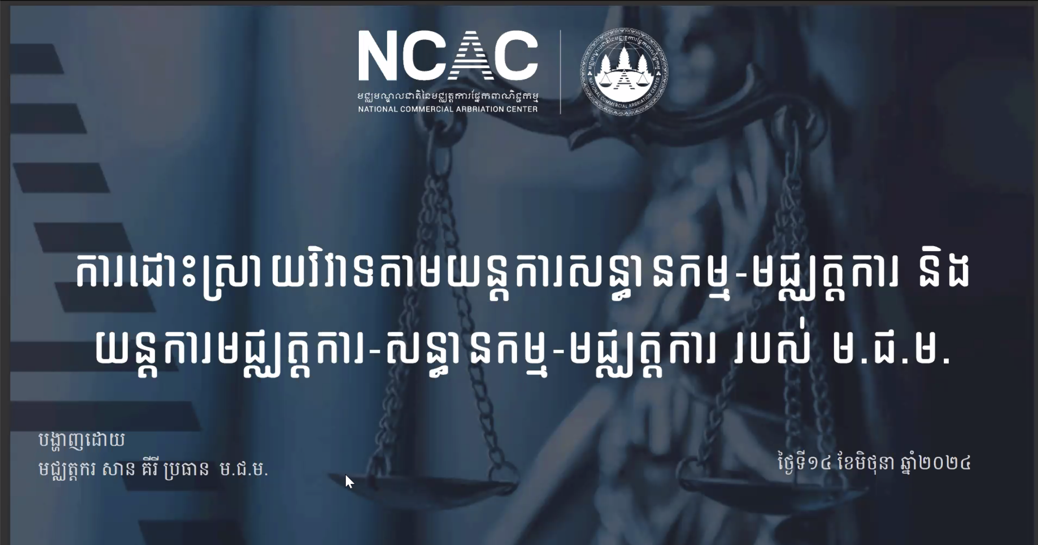 សិក្ខាសាលាស្ដីពីការដោះស្រាយវិវាទតាមយន្តការសន្ធានកម្ម-មជ្ឈត្តការ និងមជ្ឈត្តការ-សន្ធានកម្ម-មជ្ឈត្តការ របស់មជ្ឈមណ្ឌលជាតិនៃមជ្ឈត្តការផ្នែកពាណិជ្ជកម្ម (ម.ជ.ម.) Dispute Resolutions by Med-Arb & Arb-Med-Arb of National Commercial Arbitration Centre (NCAC) Webinar. បានប្រព្រឹត្តទៅនៅថ្ងៃនេះតាមរយៈប្រព័ន្ធថ្នាលបណ្តុះបណ្តាលបច្ចេកវិទ្យាពីភ្នំពេញ ក្រោមការរៀបចំដោយមជ្ឈមណ្ឌលជាតិនៃមជ្ឈត្តការផ្នែកពាណិជ្ជកម្ម (ម.ជ.ម.) ហើយមានខ្លឹមសារដូចតទៅៈ