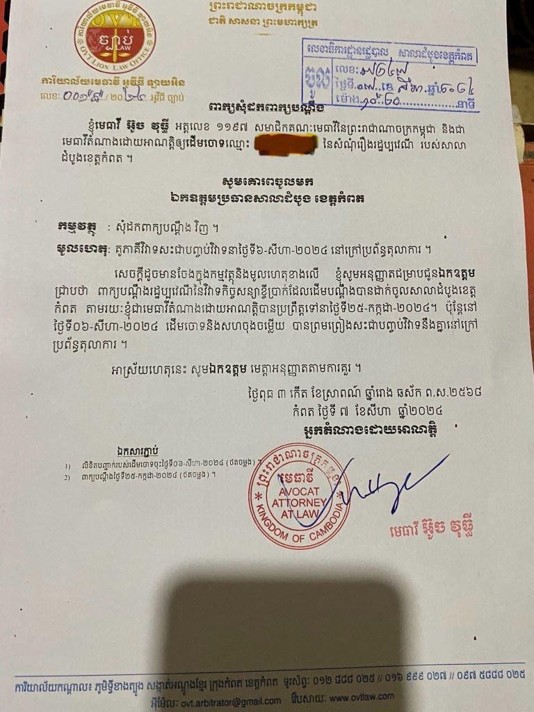 A De-Lawsuit letter submitted to the Kampot First Instance Court by OVT Lion Law Office “OVT Law” on behalf of its client on August 7th, 2024.