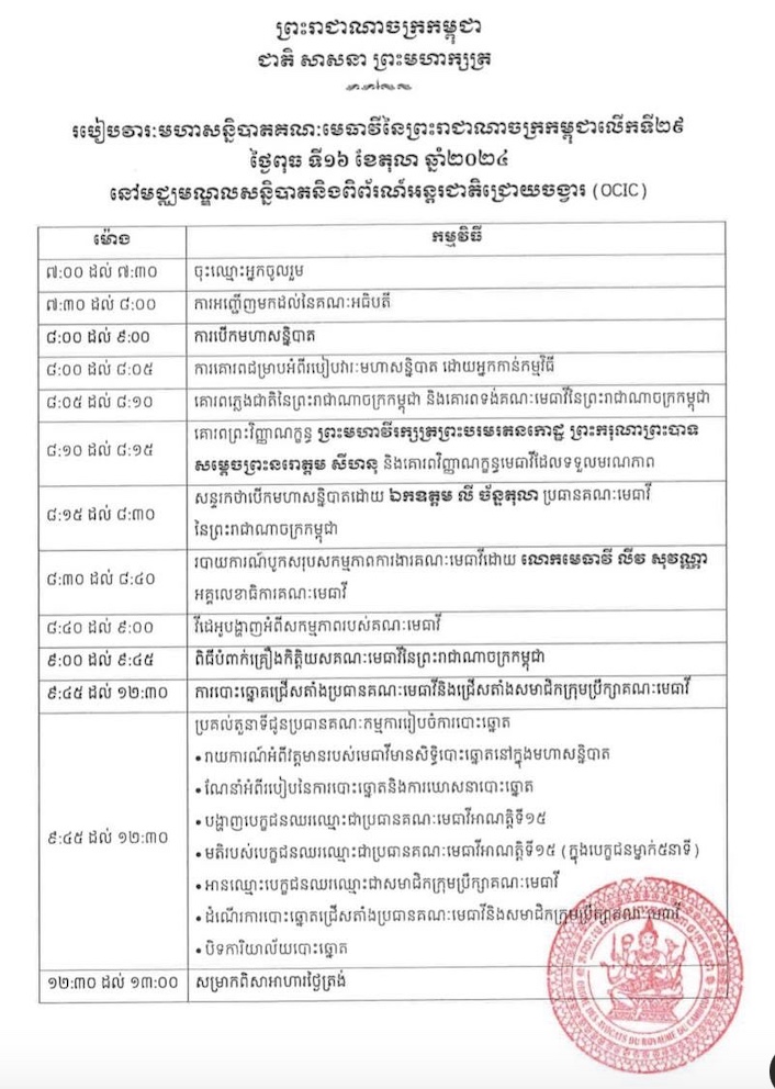 មហាសន្និបាតប្រចាំឆ្នាំលើកទី២៩ របស់គណៈមេធាវីនៃព្រះរាជាណាចក្រកម្ពុជា បានប្រព្រឹត្តទៅនៅថ្ងៃនេះទី១៦-តុលា-២០២៤ នាមណ្ឌលសន្និបាត និងពិព័រណ៍អន្តរជាតិជ្រោយចង្វារ រាជធានីភ្នំពេញ។ មហាសន្និបាតលើកនេះ ក្រៅពីការប្រជុំប្រចាំឆ្នាំធម្មតា ក៏មានការបោះឆ្នោតជ្រើសរើសប្រធានគណៈមេធាវីថ្មីសំរាប់អាណត្តិទី១៥ (២០២៤-២០២៦) និងក្រុមប្រឹក្សាគណៈមេធាវីថ្មីចំនួន៣៣ រូបសំរាប់អាណត្តិទី១១ (២០២៤-២០២៧) ផងដែរ ។ បញ្ជីឈ្មោះបេក្ខជនសំរាប់ប្រធាន និងក្រុមប្រឹក្សាគណៈមេធាវីមានដូចខាងក្រោម The 29th-2024 Annual General Assembly of the Bar Association of the Kingdom of Cambodia (BAKC) is being conducted today as October 16th, 2024 at Phnom Penh, Cambodia. This meeting is not only conducted normally for its annually meeting, but it is also prepared to elect the BAKC’s president for the 15th mandate (2024-2026) and 33 council members for the 11th mandate (2024-2026) as well. A list of candidates for the president and council members is as the following: