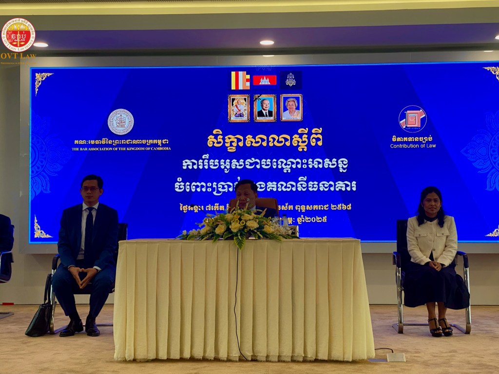 សិក្ខាសាលាស្តីពី«ការរឺបអូសជាណ្តោះអាសន្នចំពោះប្រាក់ក្នុងគណនីធនាគារ» Preservative Relief for Money in the Bank Account Workshop is being conducted today under co-organized by the Bar Association of the Kingdom of Cambodia and Contritution of Law at the BAR’s location. Its agenda and meaning are as follow: បានប្រព្រឹត្តទៅនៅថ្ងៃទី០៤-កុម្ភៈ-២០២៥ ក្រោមការរៀបចំដោយកិច្ចសហប្រតិបត្តិការរវាងគណៈមេធាវីនៃព្រះរាជាណាចក្រកម្ពុជា និងវិភាគទានច្បាប់ នាទីស្នាក់ការរបស់គណៈមេធាវី រាជធានីភ្នំពេញ ។ របៀបវារៈ និងខ្លឹមសារ នៃសិក្ខាសាលានេះមានដូចខាងក្រោម៖