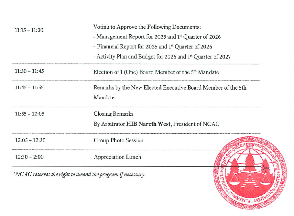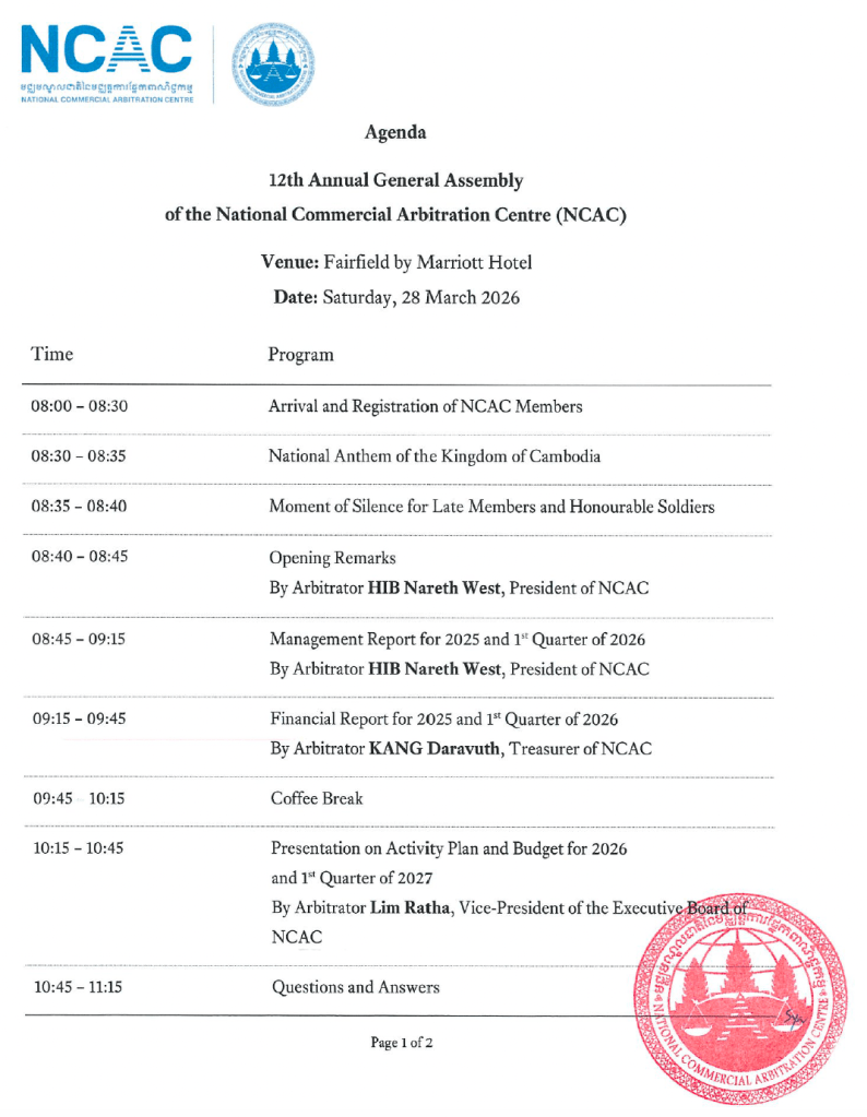 ក្នុងនាមជាសមាជិកមជ្ឈត្តករឆ្នាំទី១៥ របស់មជ្ឈមណ្ឌលជាតិនៃមជ្ឈត្តការផ្នែកពាណិជ្ជកម្ម (ម.ជ.ម.) លោកមជ្ឈត្តករ អ៊ូច វុធ្ធី មជ្ឈត្តករ Commercial Arbitrator.កំពុងចូលរួមមហាសន្និបាតប្រចាំឆ្នាំលើកទី១២ របស់វាដែលបានប្រព្រឹត្តទៅនៅរាជធានីភ្នំពេញ ។ របៀបវារៈនៃមហាសន្និបាតនោះមានដូចតទៅ៖ As a commercial arbitrator membership of National Commercial Arbitration Centre (NCAC) for the 15th year, Commercial Arbitrator OUCH Vutthy is participating its 12th GA conducted in Phnom Penh, CAMBODIA. Its agenda is as follows: