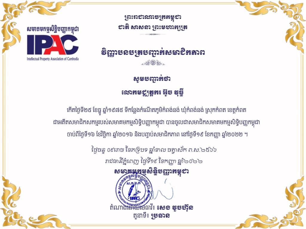 - ៦ឆ្នាំ (2016-2022) ជាសមាជិកសកម្មនៃសមាគមកម្មសិទ្ធិបញ្ញាកម្ពុជា 6 years as the Active Member of Intellectual Property Association of Cambodia (IPAC).