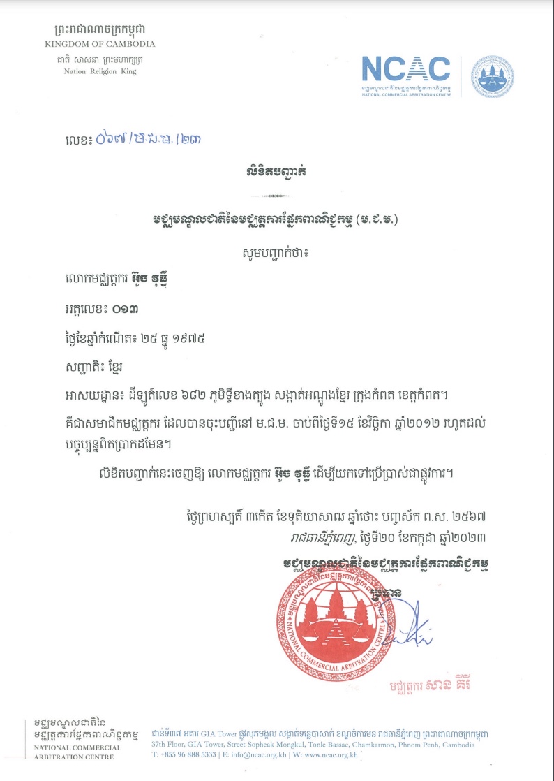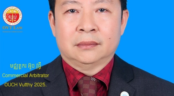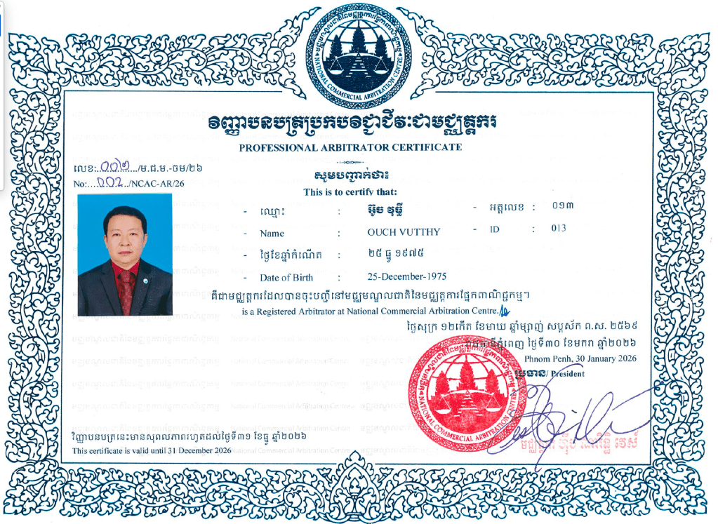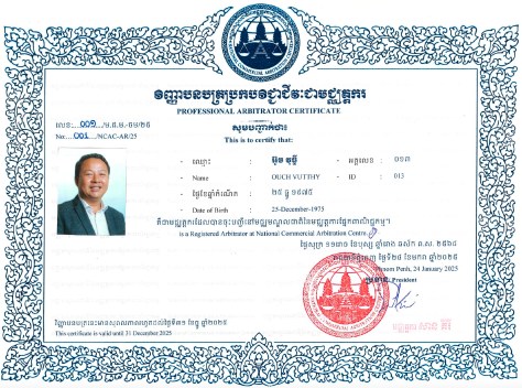 He became the first Commercial Arbitrator and Member of National Commercial Arbitration Centre (NCAC) on November 15th, 2012 based on the Prakas (announcement) of recognized from the Commission on Preparing and Selecting the First Arbitrator led by Ministry of Commerce. Starting from the first Arbitrator and Co-Founders of the NCAC, Mr Arbitrator Ouch Vutthy is always joining the professional debates, which are as workshops, conference, training, annual general assembly and registration and updating membership every year until now 14 years, 2025.