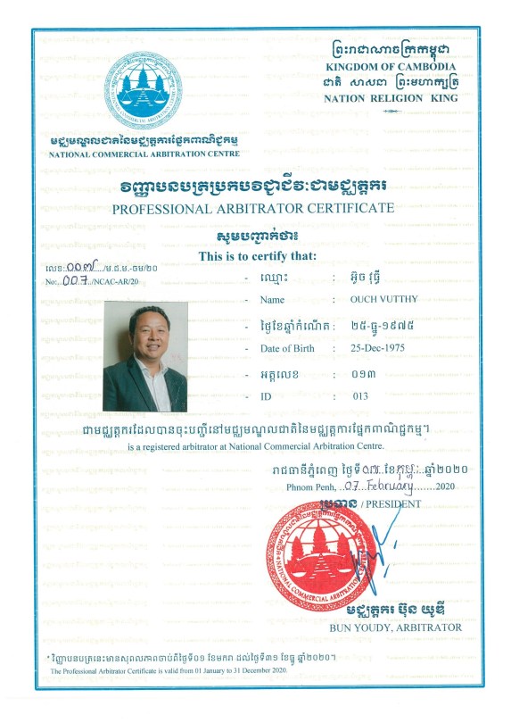 007-NCAC-AR-20_Ouch Vutthy 11/04/2020 1654 × 2340 1. អាជ្ញាប័ណ្ណ និងការទទួលស្គាល់ Licences & Accreditation. OVT Law-Professional in ADR & Litigation; Phone: (+855) 12 888 025; 016 999 027; 097 5888 025; Email: ovt.arbitrator@gmail.com; Website: www.ovtlaw.com Share on LinkedIn (Opens in new window) LinkedIn Share on X (Opens in new window) X Print (Opens in new window) Print Share on Telegram (Opens in new window) Telegram Share on Facebook (Opens in new window) Facebook Like Loading...