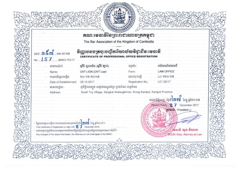 Certificates 002 17/01/2018 2338 × 1700 1. អាជ្ញាប័ណ្ណ និងការទទួលស្គាល់ Licences & Accreditation. OVT Law-Professional in ADR & Litigation; Phone: (+855) 12 888 025; 016 999 027; 097 5888 025; Email: ovt.arbitrator@gmail.com; Website: www.ovtlaw.com Share on LinkedIn (Opens in new window) LinkedIn Share on X (Opens in new window) X Print (Opens in new window) Print Share on Telegram (Opens in new window) Telegram Share on Facebook (Opens in new window) Facebook Like Loading...