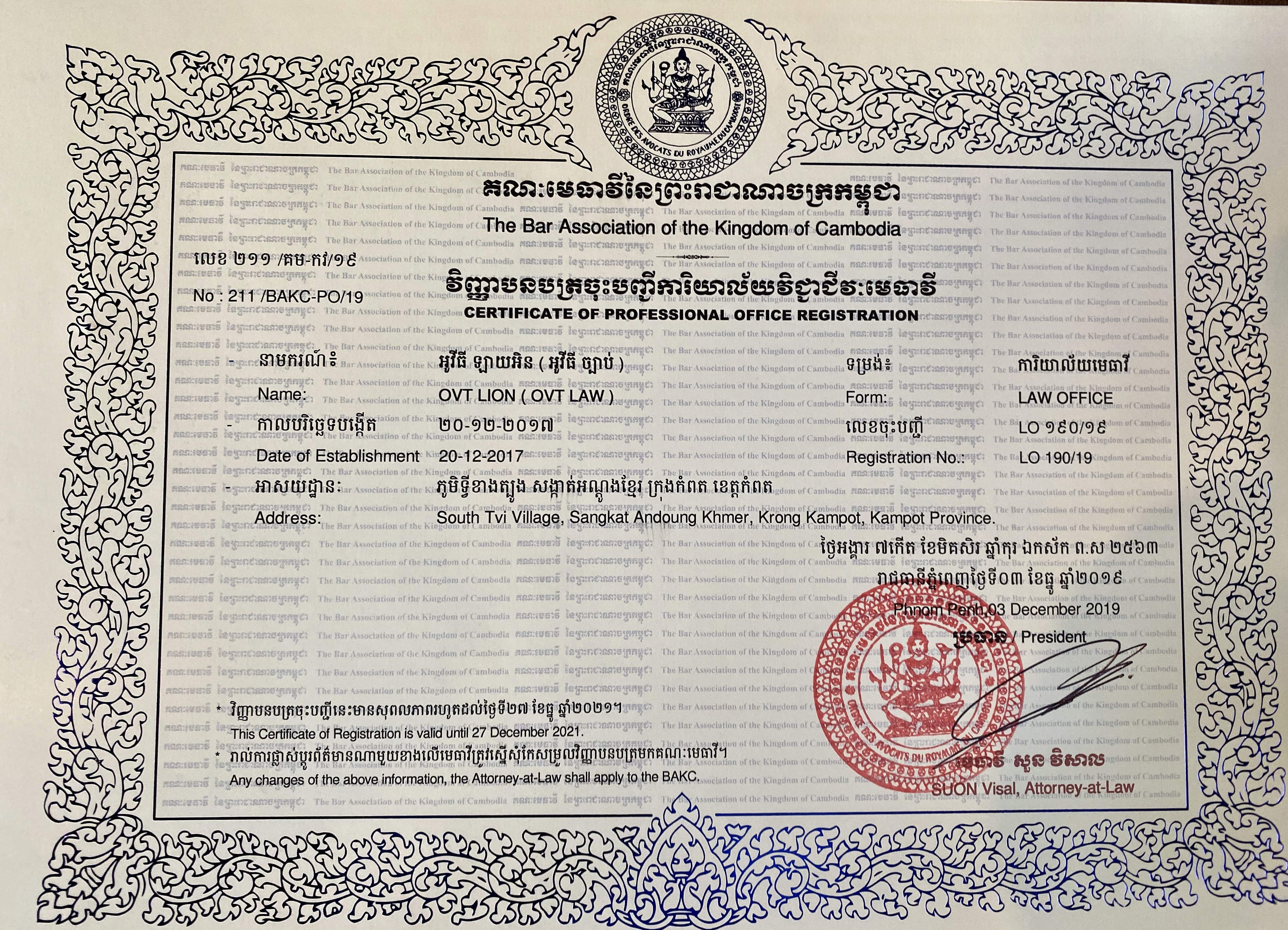 img_0277 06/12/2019 3923 × 2831 1. អាជ្ញាប័ណ្ណ និងការទទួលស្គាល់ Licences & Accreditation. OVT Law-Professional in ADR & Litigation; Phone: (+855) 12 888 025; 016 999 027; 097 5888 025; Email: ovt.arbitrator@gmail.com; Website: www.ovtlaw.com Share on LinkedIn (Opens in new window) LinkedIn Share on X (Opens in new window) X Print (Opens in new window) Print Share on Telegram (Opens in new window) Telegram Share on Facebook (Opens in new window) Facebook Like Loading...